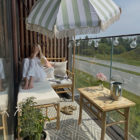Beate bamboo är en modul loungesoffa för din balkong eller andra utomhusutrymmen. Bygg din egen större soffa med modulerna som finns i en vänster-, en höger- och en hörnversion. Eller använd dem separat. Med bredder 100, 120 och 140 cm är sidomodulerna gjorda för att passa perfekt på balkonger som ofta är 110, 130 eller 150 cm djupa.