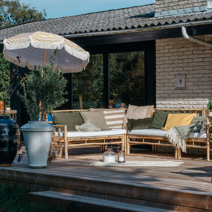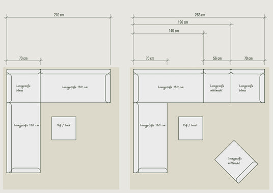 Här kan du se hur du kan utöka din loungegrupp genom att välja moduler i olika storlekar och kombinera dem på olika sätt. Oavsett om du har en stor terrass eller en balkong och vill skapa det ultimata utomhusområdet för mysiga stunder, kan du skapa en hörnuppsättning som börjar vid 100 × 70 cm och kan växa ända upp till 266 × 266 cm.