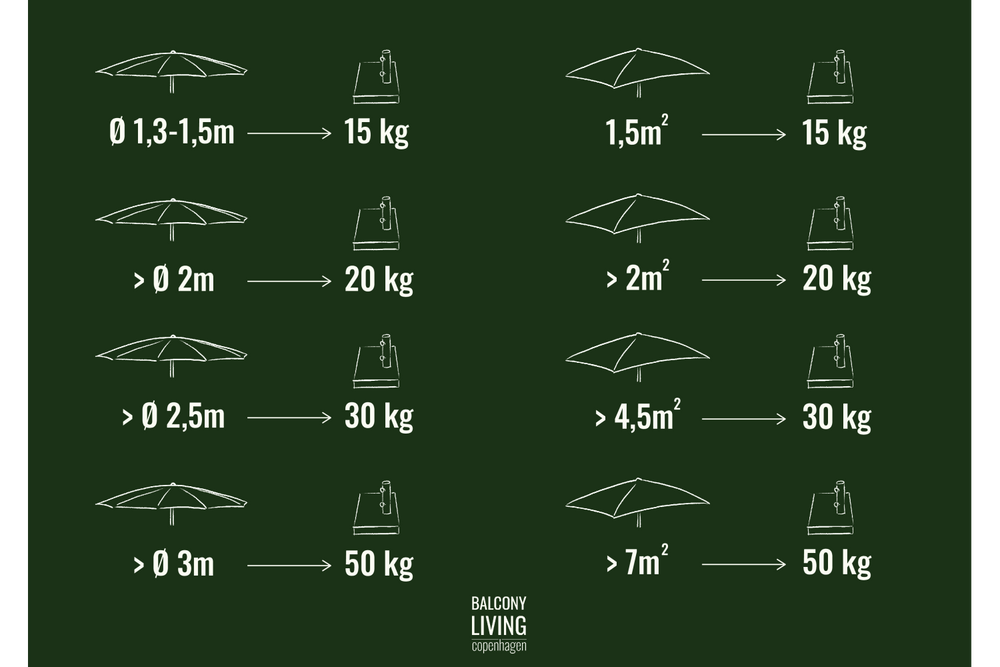 När du köper ett fäste eller en parasollfot till din balkong behöver du ta ställning till flera saker. Här kommer en liten överblick över vad du bör tänka på och vad du ska mäta innan du köper parasoll.