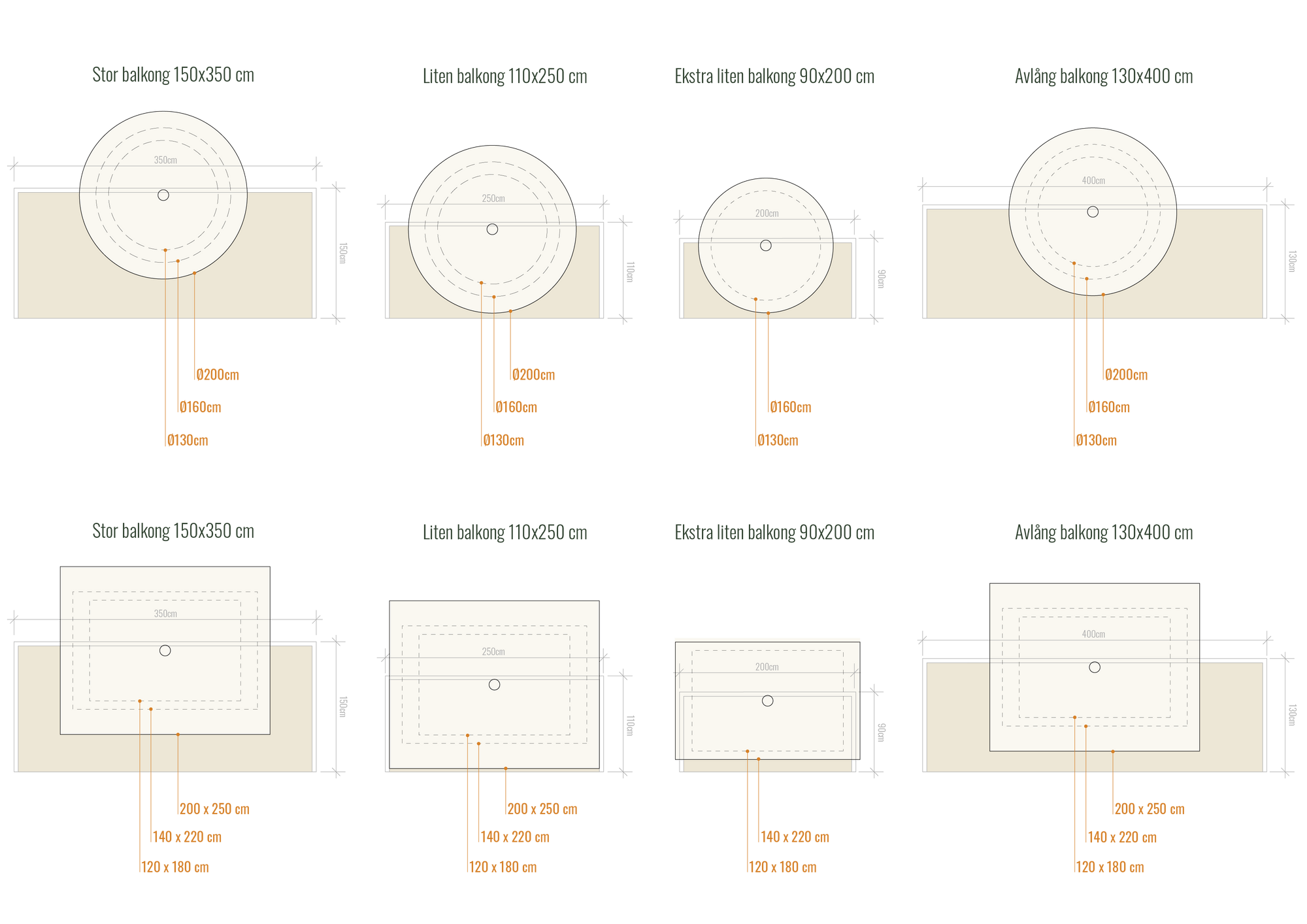 Därför har vi nu gjort en visuell skiss över hur de olika storlekarna av parasoller passar på olika längder och djup av balkonger.